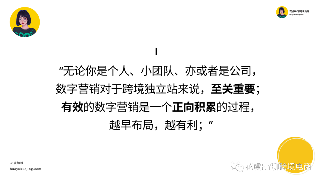 - ”无论你是个人、小团队、亦或者是公司,数字营销对于跨境独立站来说,至关重要;有效的数字营销是一个正向积累沉淀的过程,越早布局,越有利;”