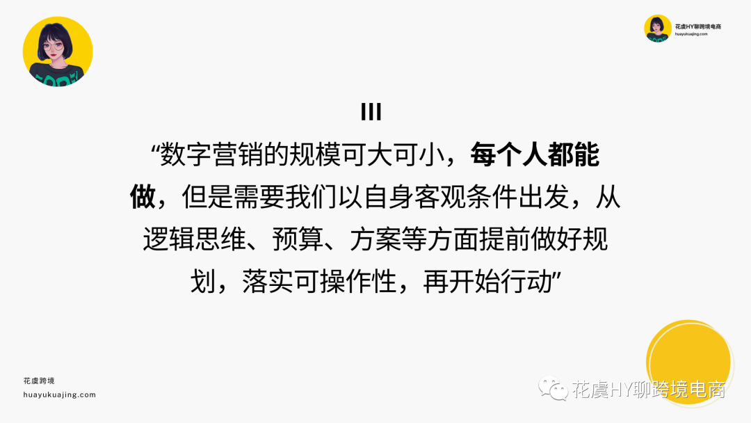 3.”数字营销的规模可大可小,每个人都能做,但是需要我们以自身客观条件出发,从逻辑思维、预算、方案等方面提前做好规划,落实可操作性,再开始行动;”