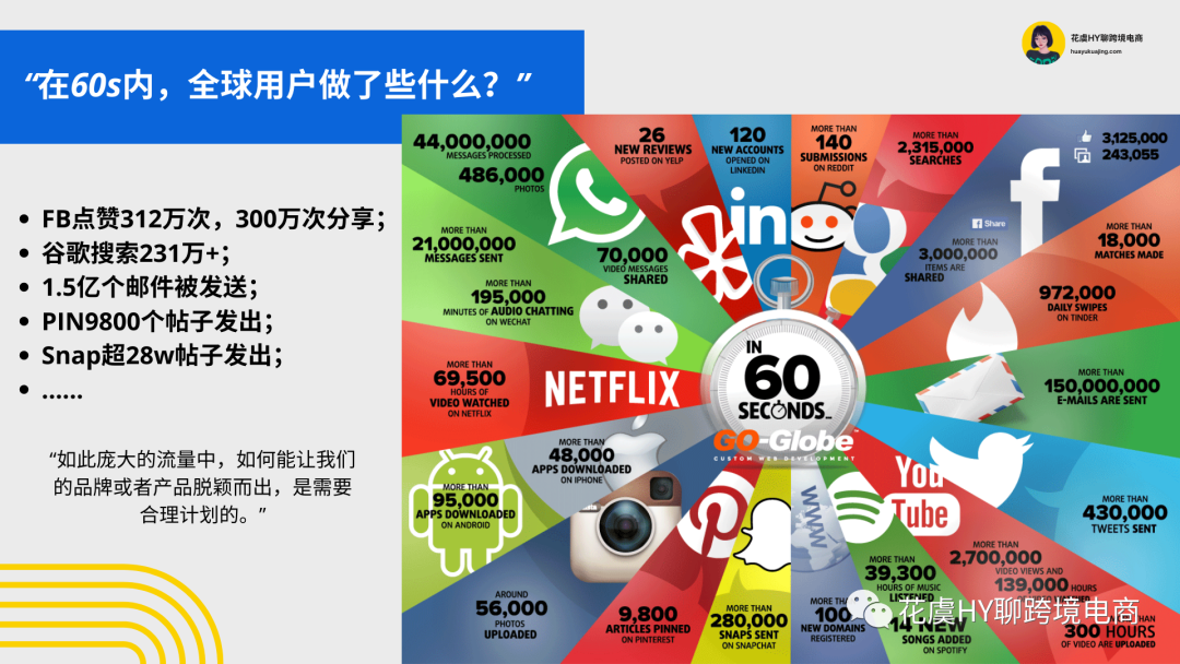 短短的60s时间内,实际线上流量的交织是非常庞大的,,但是这也反映出来,“如此庞大的流量中,如何能让我们的品牌或者产品脱颖而出,是需要一个非常合理计划的。”,这也就是为什么数字营销很重要的原因。