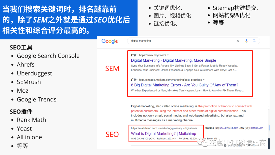 可以看到,当我们在搜索引擎中搜索关键词时,除了sem排名之外就通过seo优化后的排名,谷歌根据你的综合评分对用户进行推荐,比如我搜索digital marketing的时候,目前出来的是mailchimp的blog链接,如果我们能将我们独立站相关性较高的关键词做进谷歌前十页,流量都是非常可观的。
