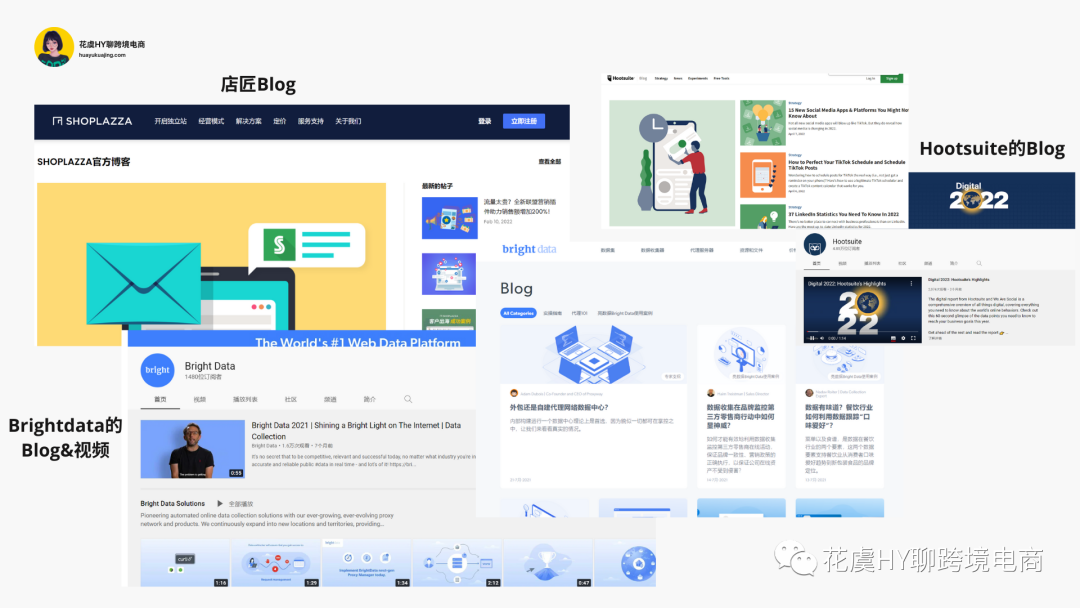 比较大的网站,无论是哪一种类型的,都会有自己的content板块,最常见的就是Blog,比如店匠的blog分享的是关于跨境独立站相关干货、Brightdata的blog还有油管分享的是关于数据收集和IP的技术性内容、而hootsuite则是分享营销相关的内容。