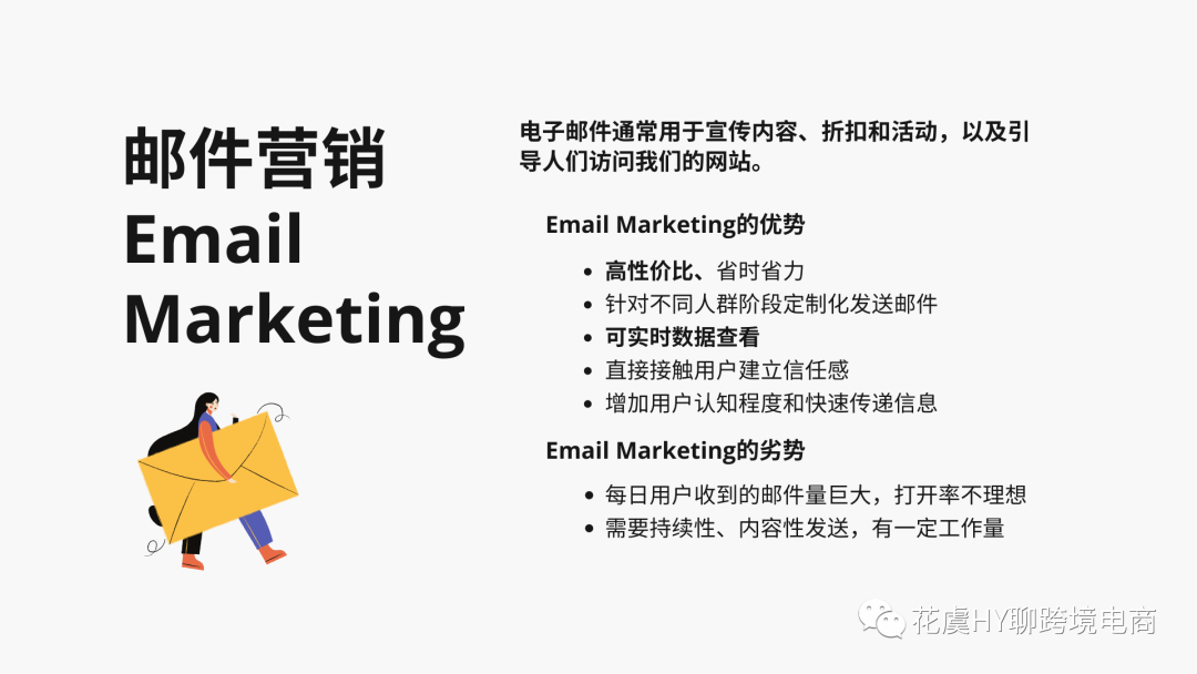 最后一个是邮件营销,邮件营销可谓是贯穿了整个营销路径,他能够直接送达给用户,通常用于宣传品牌,提醒活动,吸引用户再次进入网站。