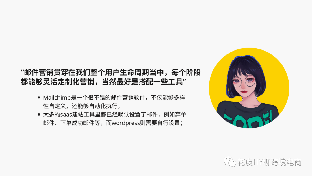 目前很多人对于邮件营销是不太看中的,但是其实他对我们的营销是能够起到非常大的作用的。不过由于邮件营销是一个工作量比较大的事情,所以我们需要借助一些工具去配合。例如我常用的是mailchimp,除了能够设定不同人群组,分类自定义发送之外,还能够实现很多的自动化任务,无论对于新手或者老手来说,确实是非常方便的。