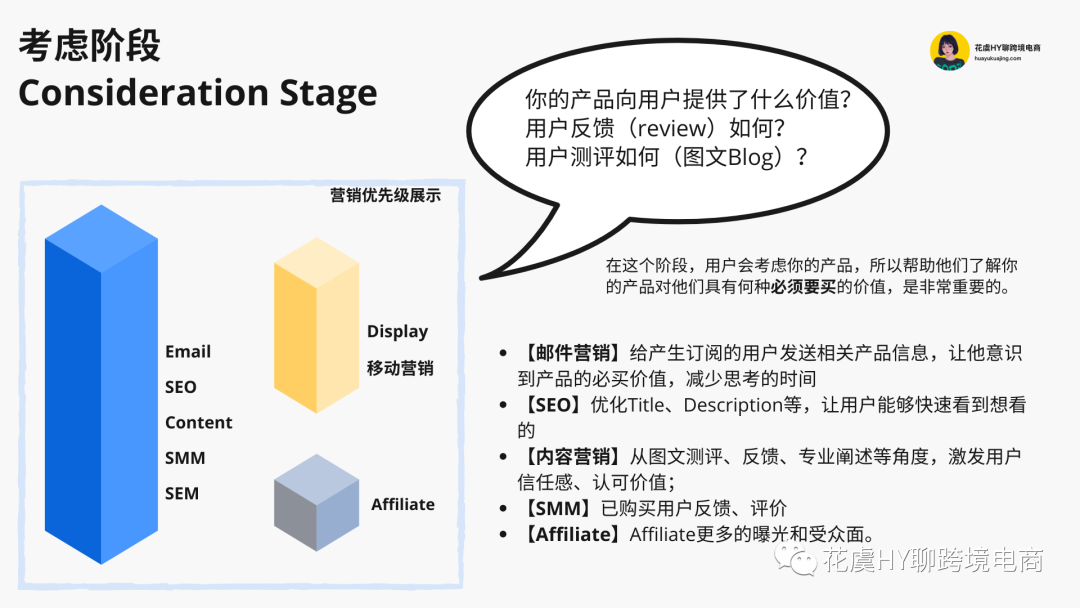 在考虑阶段,我们的营销优先级:email-SEO-content-SMM-SEM