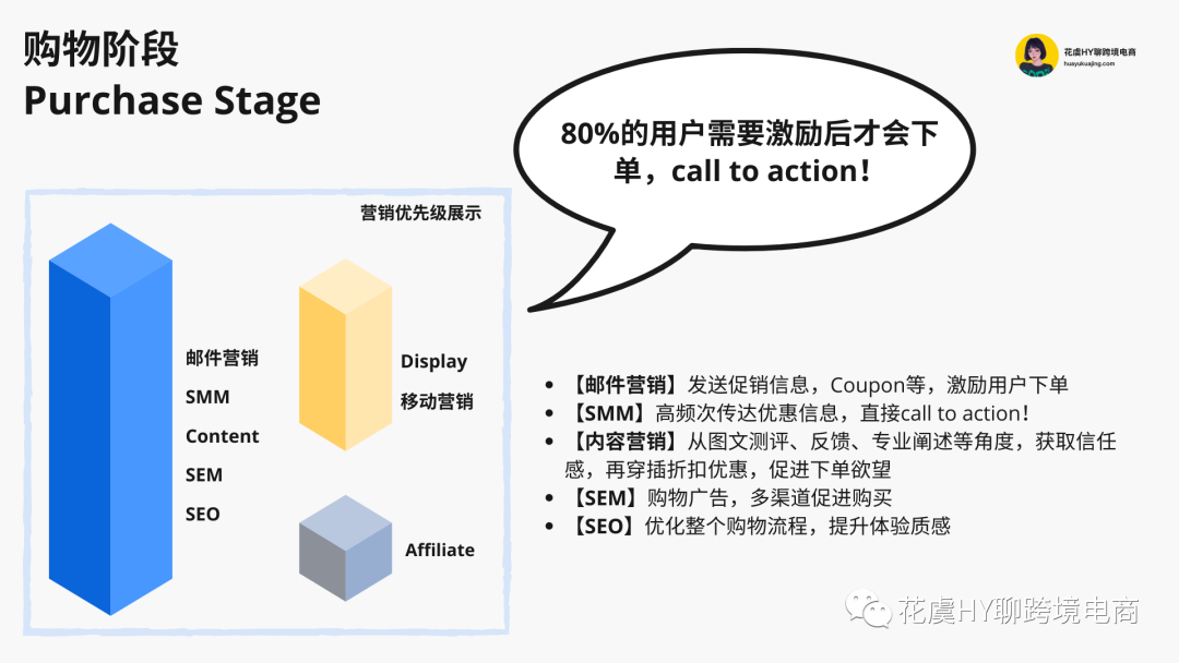 在购买阶段,我们的营销优先级:email-SMM-content-SEM-SEO