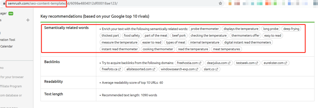 选择关键字的方法有很多,通过Semrush的SEO Content Template工具,输入主要关键字就可以获取Semrush根据排名靠前的10个竞争对手的内容获得的推荐关键字: