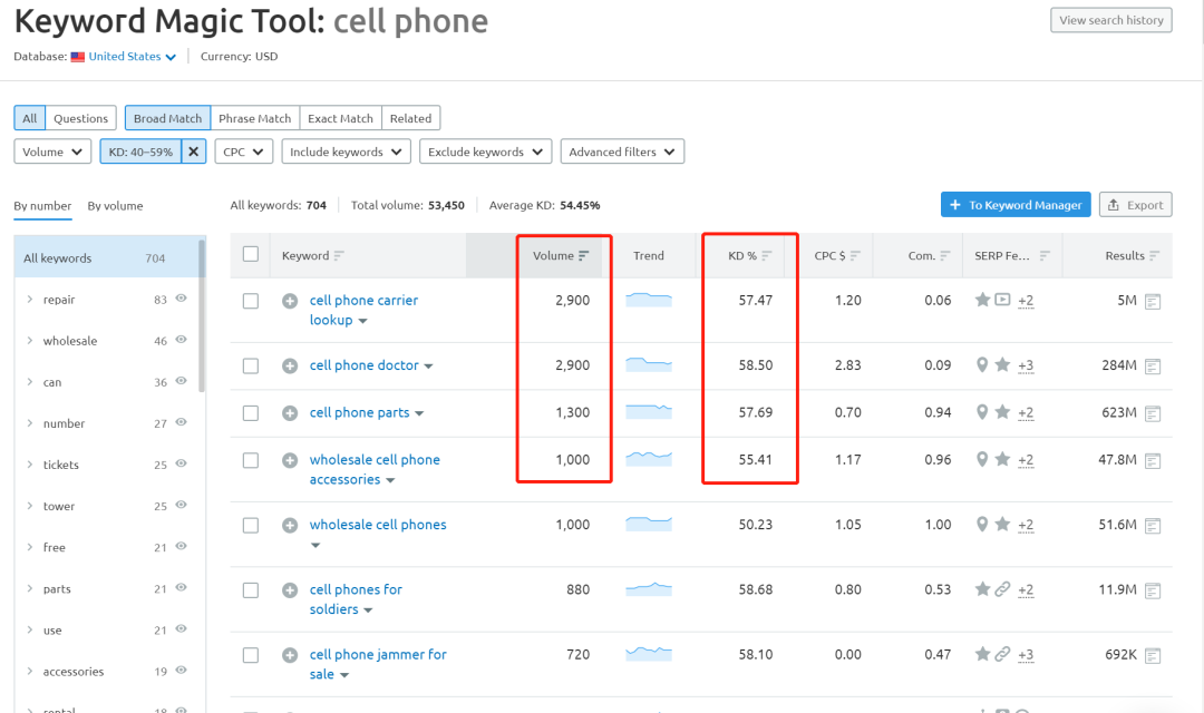 或者您可以通过Semrush的Keyword Magic Tool 工具来找到那些搜索量高(Volume),但是难度相对较低的词语(KD%)。