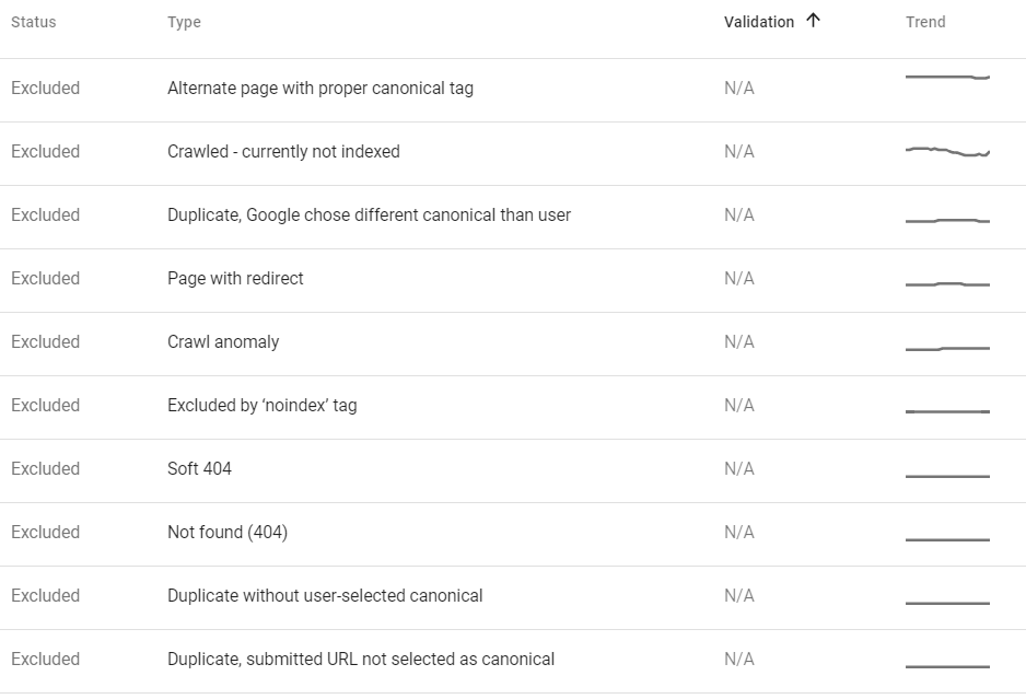 最直接的方式就是在Google Search Console后台的“Coverage”报告中查看索引错误或被排除索引的问题链接列表,它会很清晰的显示你的网站因为什么原因而没有被索引,如下图所示: