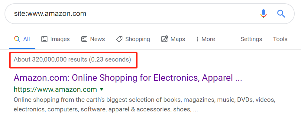 如果想知道网站被收录了多少页面,除了Google Search Console中的Valid URL数量,使用查询命令site:www.example.com也能得到网站页面索引数(取决于网站的规模,仅作为参考值)
