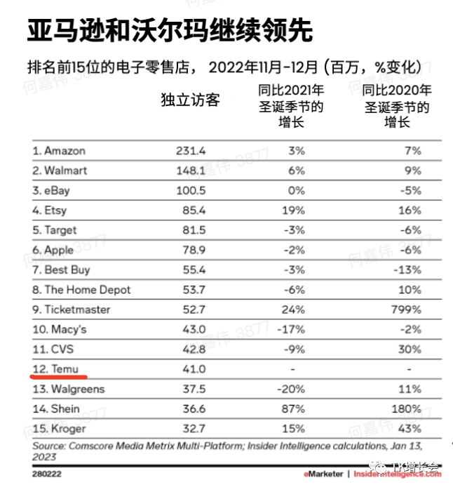 不说App下载超过亚马逊,有数据显示,去年访客数已经超过shein,排到美国购物第12名了。