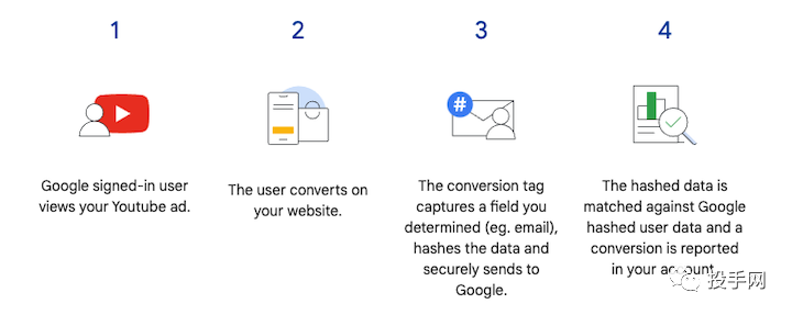 经过哈希处理的数据发送给 Google 后,系统会将其与已登录帐号的 Google 帐号进行匹配,以将广告系列转化归因于广告事件,例如点击次数或观看次数。此过程可确保广告客户在保护用户隐私的同时准确跟踪转化情况。