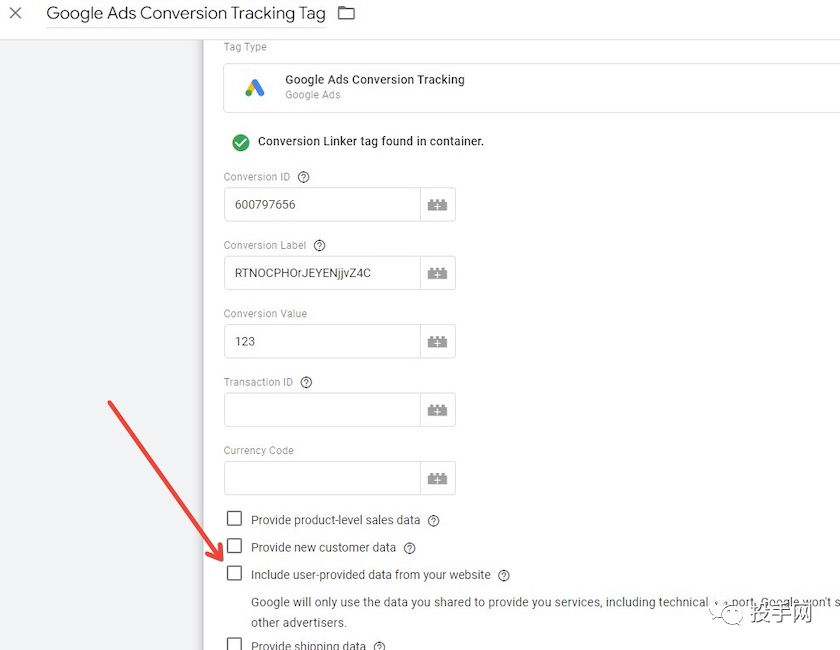 6.然后在 GTM 中找到您的 Google Ads 转化跟踪代码并选中此复选框。