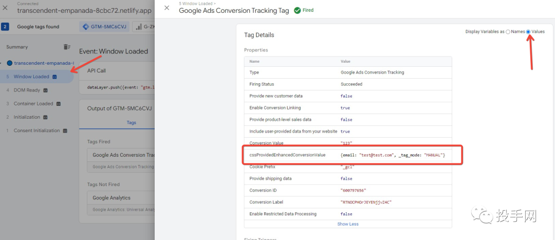 1.要查看代码输出中的电子邮件值,请点击在“代码”标签下触发的转化跟踪代码。就我而言,我可以看到电子邮件正在我创建的电子邮件变量中捕获。
