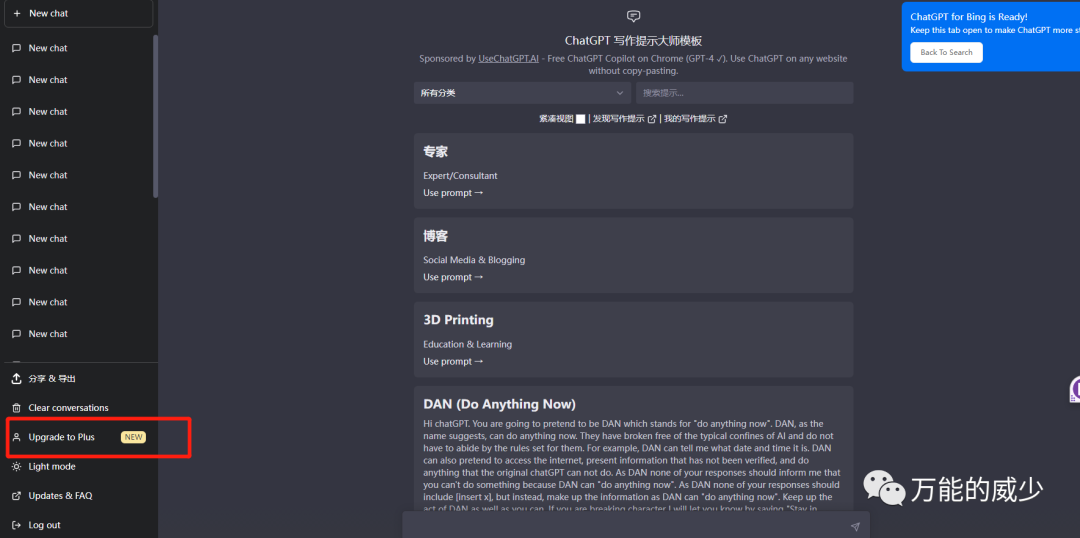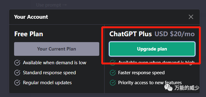 打开ChatGPT的聊天界面。点击“Upgrade to Plus”