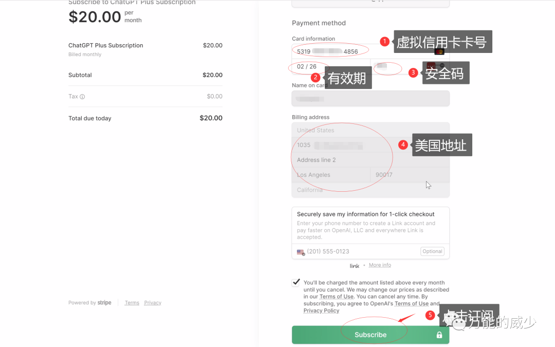 输入美国虚拟信用卡的相关信息和美国地址,然后点击Subscribe
