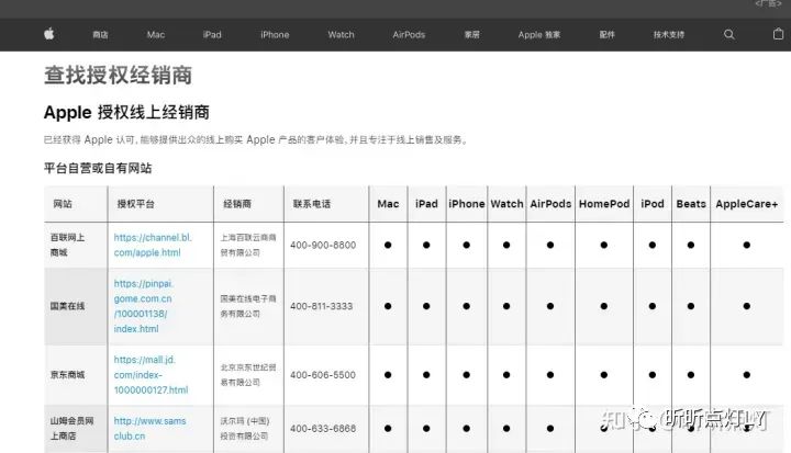 看个例子:Apple官网的经销商页面,罗列了20多个下游的经销商网站。