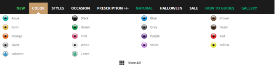 如下图这个美瞳网站,我们通过分析关键词,发现大的关键字簇都是和颜色、风格、使用场景相关的,因此它的导航是这样设置的(下图)。思考一下,它为什么不按照材质,或者花纹设置网站导航,因为人们的搜索需求不在这上面。