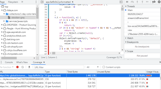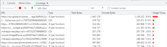 使用 Chrome DevTools 中的Coverage 选项卡来识别哪些代码是关键的,哪些代码是未使用的。点击查看细分代码。
