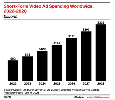 虽然欧美厂商在短视频赛道的布局稍微落后于国内厂商,但面对巨大的商业化潜力,依旧难免心动。根据 eMarketer 的数据显示,2023 年全球短视频广告支出将达 980 亿美元,到 2028 年将进一步增长至 2250 亿美元。