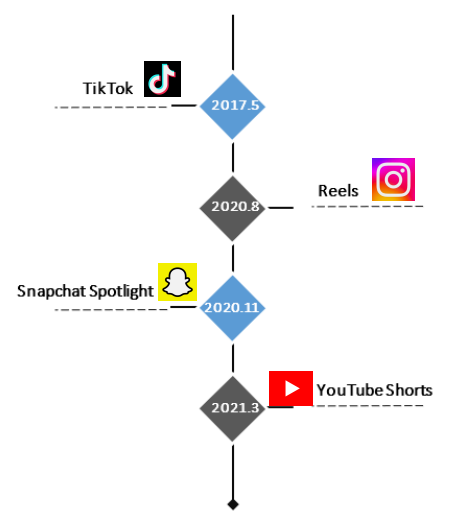 在参与到短视频赛道的大厂中,TikTok、YouTube Shorts、Reels 显然是在商业化上进展最快的玩家。回溯几个平台的发展历史,会发现几个平台的路线基本一致,“创作者基金上线→广告产品上线→创作者广告分成”。