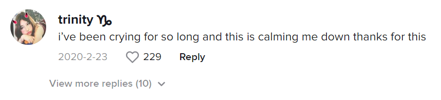 这位女生反应更是夸张。她评论道:“我已经哭了很久很久,而这个视频让我平静下来,谢谢。”