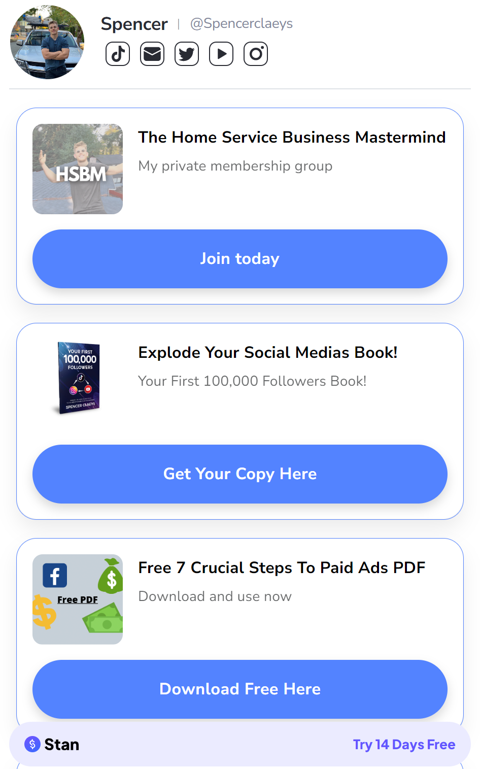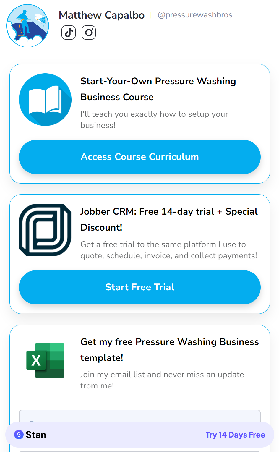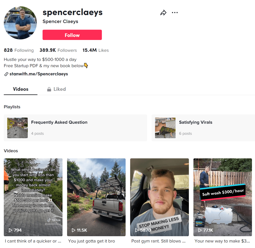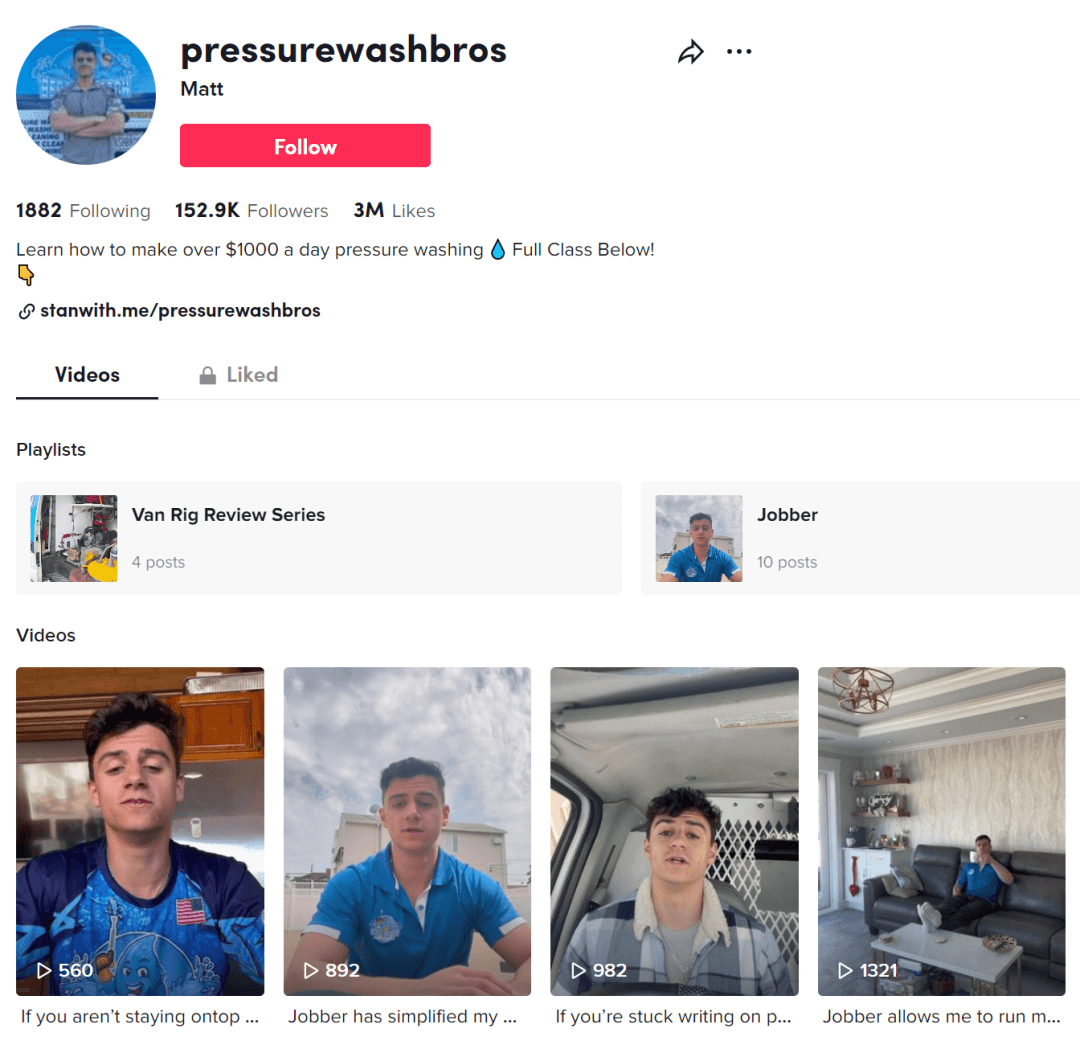 这位美国小哥勤奋地发视频可不仅仅是为了获取需要清洁的客户,从他的 BIO 上的信息我们就可以看到,小哥还有另外一条业务线:卖课。