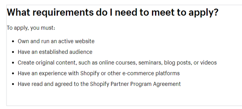 先说这样的项目我们能不能做,在 Shopify 的官网下方,很明显可以看到 Shopify Affiliate 的申请链接。我们可以在上面发现申请 Shopify Affiliate 的申请条件,说实话这些条件其实并不难。