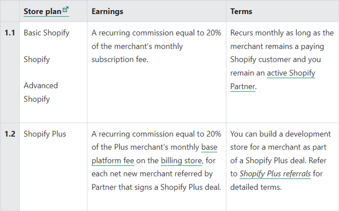 继续搜索,发现在“Shopify Partner Earnings”这个页面中,官方详细的解释了每一个 Commission 的抽成比例(具体信息见下图)。