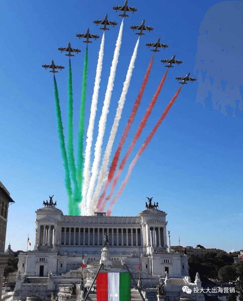 可参考下面这则投放到意大利和圣马力诺的图片素材,用最大字号展示“Festa della Repubblica”,将意大利国旗标志的红、绿、白色与促销文字融为一体,完成致敬。与之相匹配的文案则是“Festa della Repubblica,Per un cincin di gusto”(共和国日,为品味欢呼)。