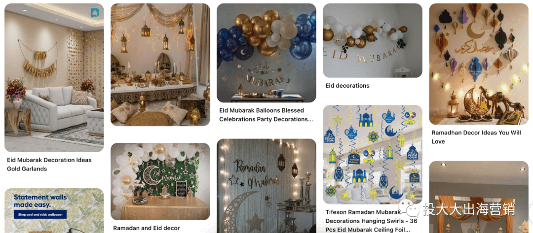 其中搜索频率较高的词汇包括:Eid Mubarak decorations、Eid al-Adha greetings、Hijabi Eid outfits、Henna Eid designs,可才参考相关帖子作为素材来源。