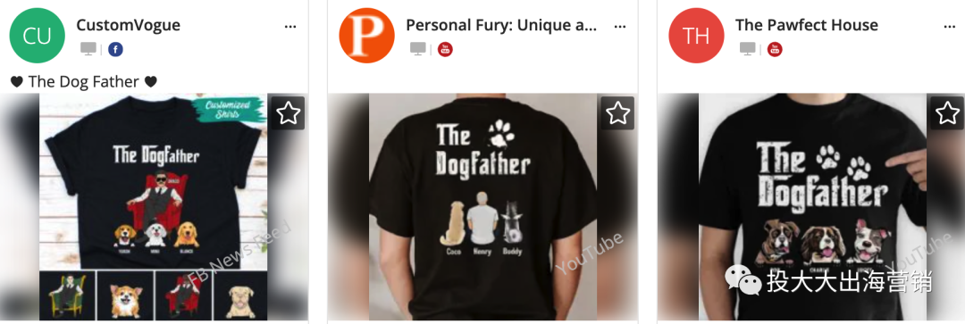 而且,不只在父亲节,宠物定制类商品在国外一直很受欢迎,这类素材往往投放时间较长,因此广告文案中除了“父亲节礼物”关键词之外,也多会带有“生日礼物”“聚会礼物”这样的关键词。