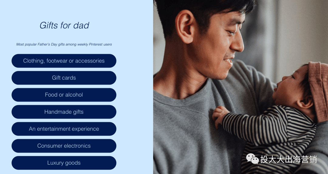 Pinterest数据显示,仅在美国地区,与父亲节相关的帖子有2.3千万条被收藏的帖子,1.3千万的搜索量,且这个数字到今年增长到了1.7千万,涨幅约为31%。