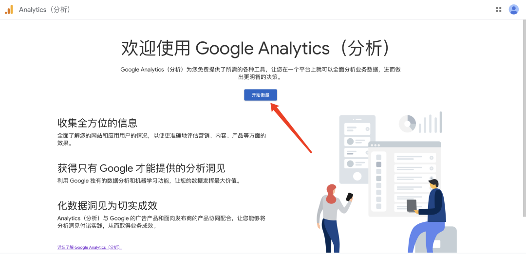 1)进入网址:analytics.google.com 并用自己的谷歌账号登录,并点击“开始衡量”。