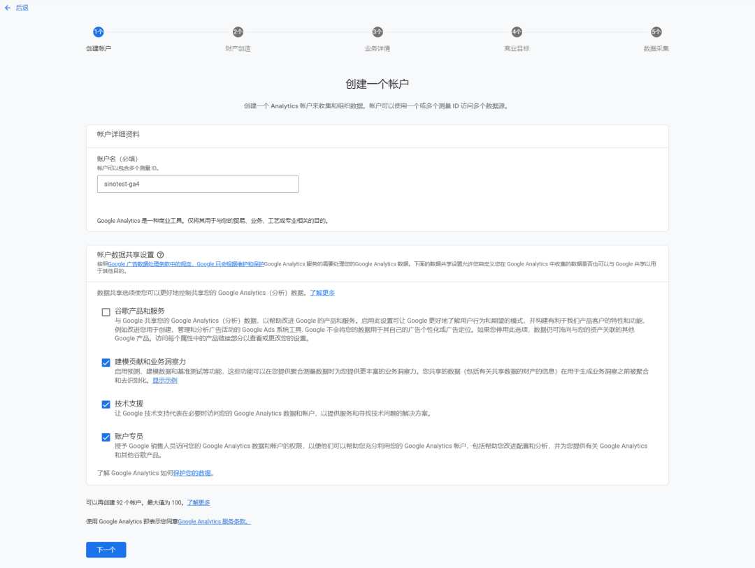 2)输入“账户名”,以及勾选如图的选项,并点击下一项。(如已创建过账号的可跳过此步)