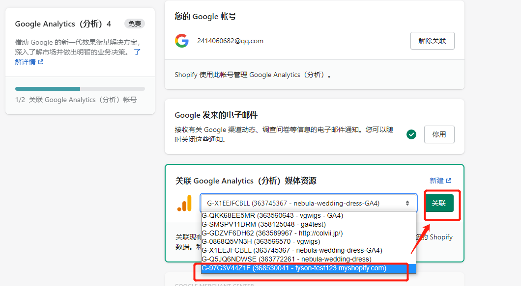 3)关联Google账号后,在【关联Google Analytics(分析)媒体资源】下拉,选择之前配置的GA4媒体资源。