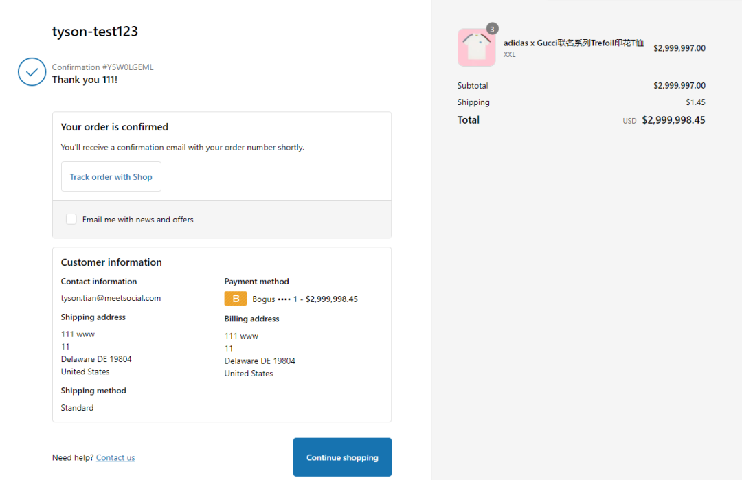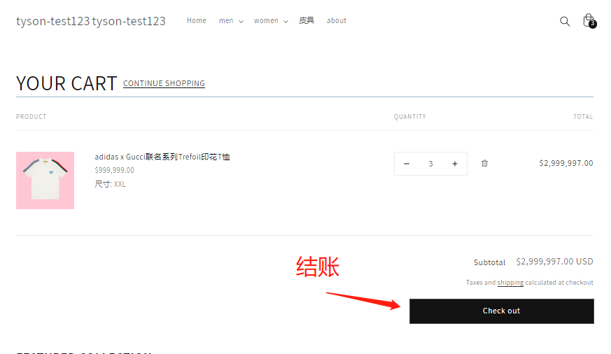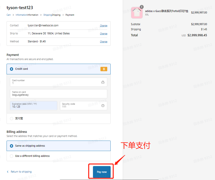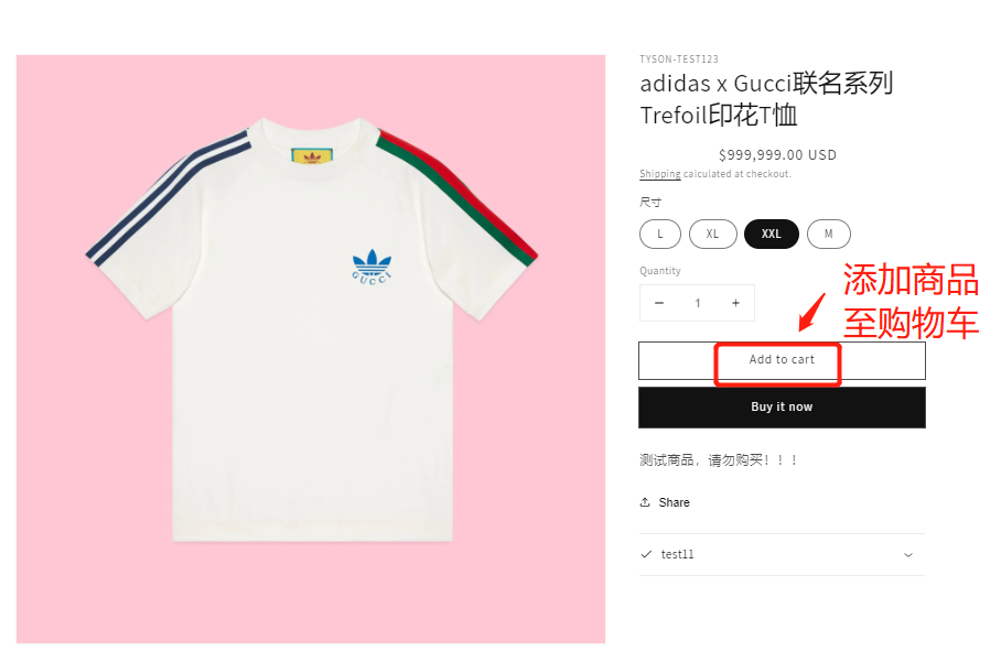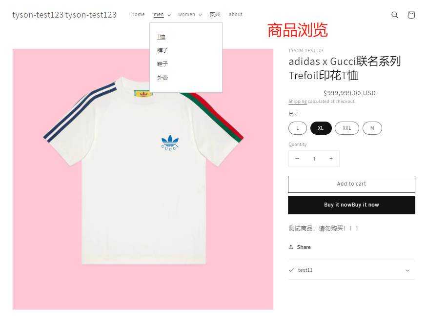 5)配置完成后,访问Shopify独立站地址,按照流程,依次进行【商品浏览】、【添加商品至购物车】、【发起结账check out】、【下单支付】等流程。