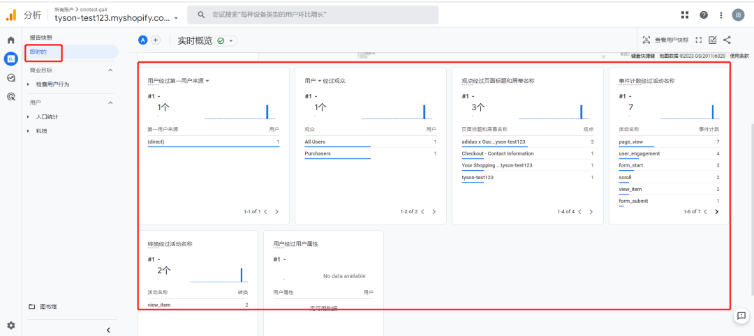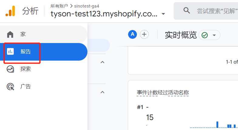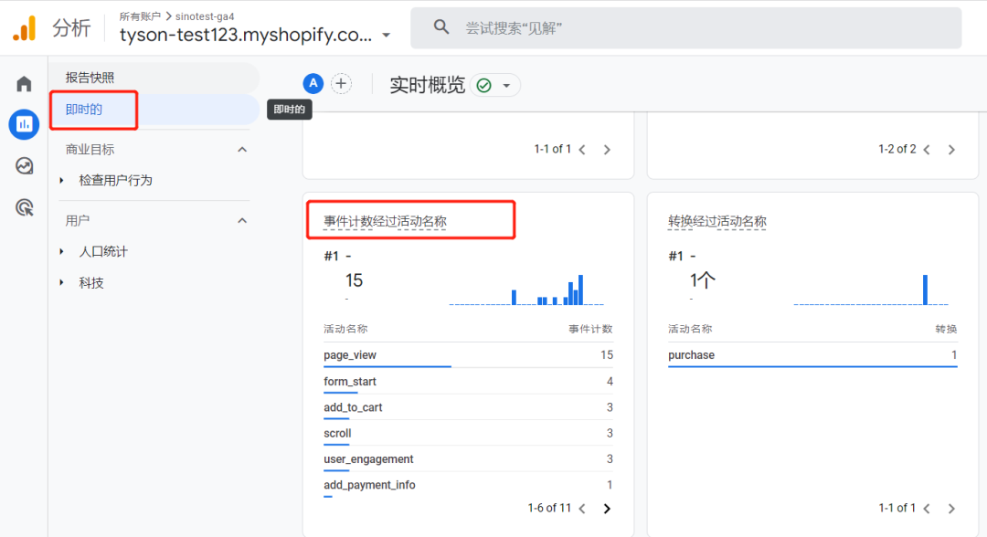 1.通过 GA4 后台实时看板检测,点击【报告】-【即时性】,查看事件是否有生成