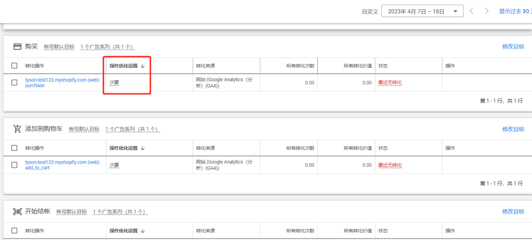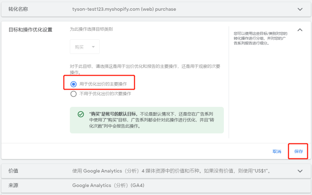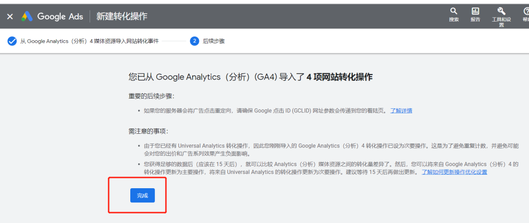 注:如果有 Universal Analytics 转化操作,导入的 Google Analytics(分析)4 转化操作需要设为主要操作,将Universal Analytics的转化操作设为次要操作,这是为了避免重复计数,并避免可能会对您的出价和广告系列效果产生负面影响。