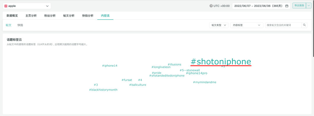 利用OneSight营销云的话题标签云分析功能可以直观看到,#ShotoniPhone在近一年中仍是Apple的Instagram主页使用频次最高的标签: