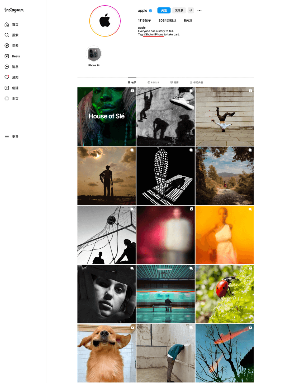 苹果鼓励Instagram用户在发布用 iPhone 拍摄的视频与照片时,加上“#ShotoniPhone”的标签。苹果的团队成员会根据这一标签筛选出优质的图片与视频,发布在苹果的官方账号上。同时,苹果也会穿插发布职业摄影师的作品,以此激发用户的灵感和创造力。