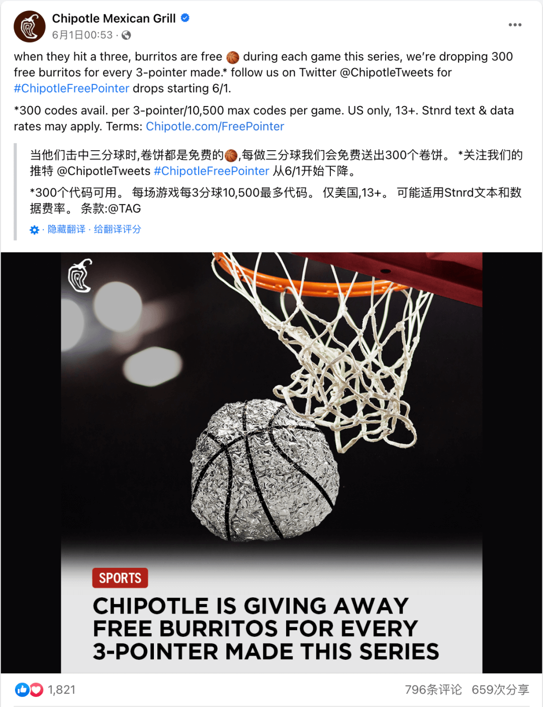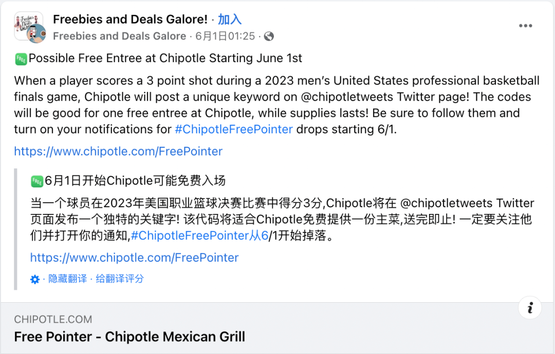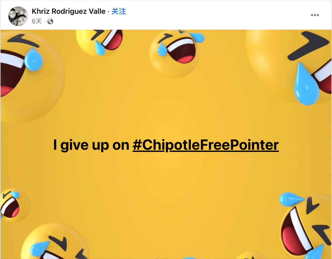 Chipotle Mexican Grill(奇波雷墨西哥烧烤)上周在社交媒体上发布了一个免费送卷饼活动,使用了#ChipotleFreePointer这个标签,制定了相应规则及参与方式,带有#ChipotleFreePointer标签的帖文在社媒上得到广泛传播: