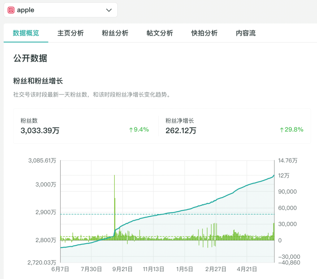 Apple的Instagram主页数据所展示的粉丝增长曲线诠释了这一点,月均20万的粉丝增量形成了一条非常健康的粉丝增长曲线:
