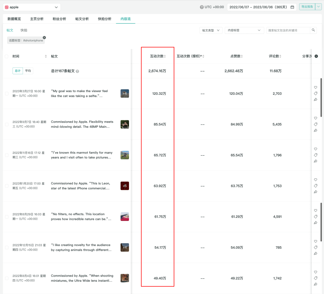 OneSight营销云的内容流页面所展示的#ShotoniPhone相关帖文数据显示了该话题标签下的帖文互动量也十分可观: