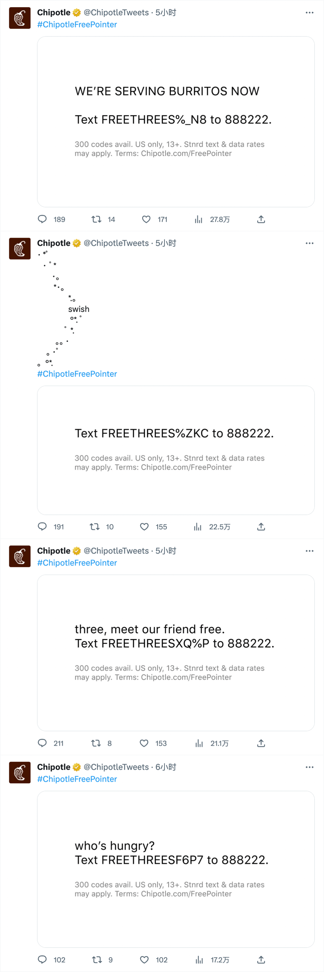 Chipotle Mexican Grill的Twitter主页上,#ChipotleFreePointer推文查看量短短几小时就达到了一二十万: