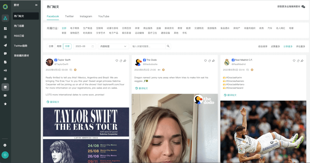 浏览更多海外社媒上的优质内容可能有助于触发你的灵感。OneSight营销云提供了Facebook、Twitter、Instagram、YouTube等平台的热门帖文,涵盖了超过30个行业,为内容运营者提供了一个巨大的资源库: