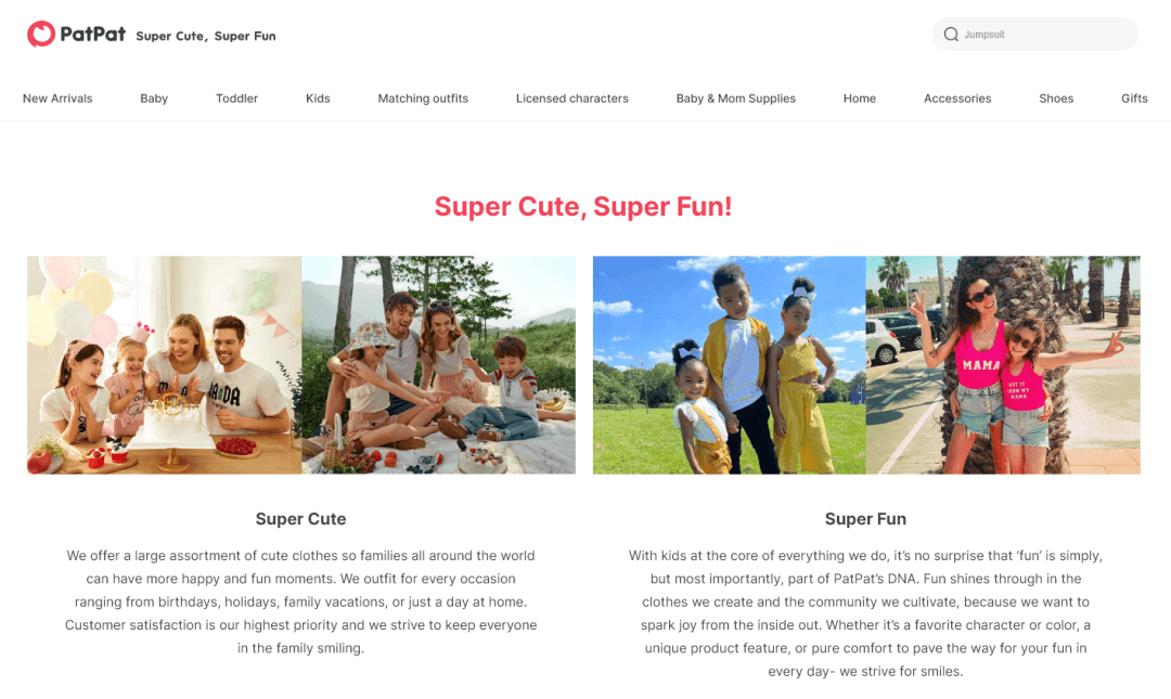 在海外母婴产品主打质量、定制和舒适度的大背景下,PatPat却独树一帜地打出了“Super Cute,Super Fun”的Slogan,将“Cute”作为了品牌的核心卖点。