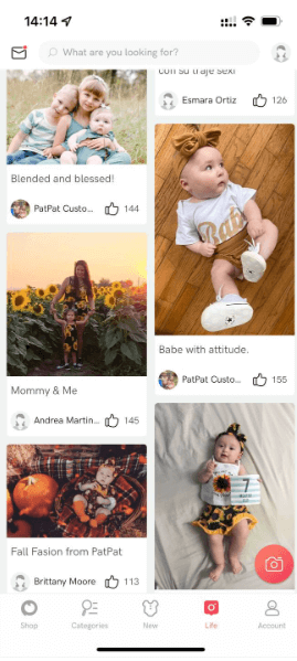 除了成立妈妈团,PatPat还在官网APP设置了单独的社区内容分享模块—Pat Life,宝妈们可以在社区内尽情晒娃。并且PatPat还设立了积分奖励制度,从而进一步鼓励买家分享宝贝穿搭以及可爱照片。