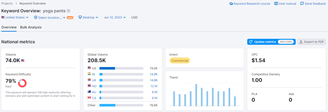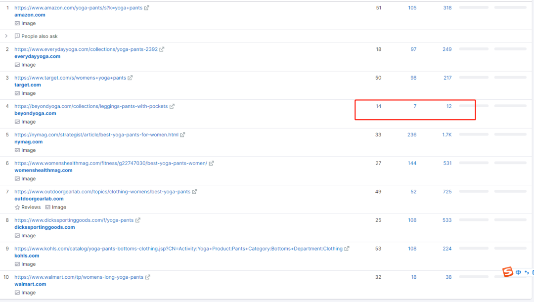 通过查看关键词的概览信息,你会发现“yoga pants”这个关键词的竞争异常激烈。对于像我们这样的小白来说,非常不友好,要去做这样的关键词排名,无异于蜀道之难。