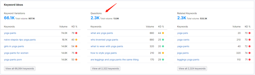 其一,通过 SEMRUSH 等数据分析软件,看看与目标关键词相关的 “Questions”,看看有没有合适的关键词;