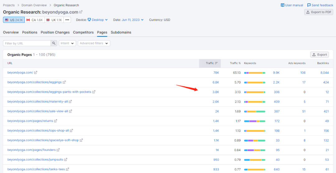 除此之外,还可以进入到该网站的 Top Page 信息区域,看看整个网站,流量最大的页面主要有哪些。根据“二八定律”,网站 80% 的流量基本来自于 20% 的页面,去看看那些 20% 的页面,它们的排名关键词到底是什么。逐一点击进去看看,并记录下那些低竞争的蓝海关键词。
